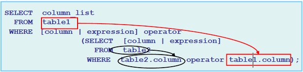 - 메인쿼리와 서브쿼리간의 결과를 교환하기 위하여 서브쿼리의 WHERE 조건절에서 메인쿼리의 테이블과 연결