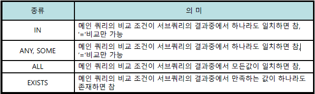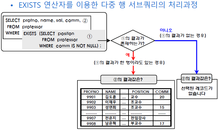 - 서브쿼리에서 검색된 결과가 존재하지 않으면 메인쿼리의 조건절은 거짓