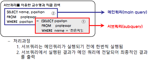 - 메인쿼리절과 서브쿼리간에 검색 결과를 교환하는 서브쿼리