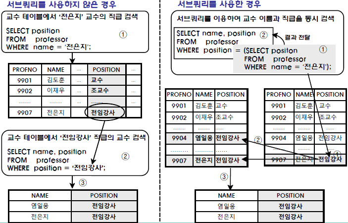 - 메인쿼리와 서브쿼리에서 비교하는 칼럼의 수는 반드시 동일해야 함