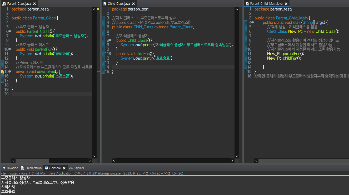 //메인 클래스 실행시 부모클래스 생성자부터 출력되는 것을 보아 자식클래스가 부모클래스의 속성/기능을 상속받았다는 것을 알 수 있음반응형